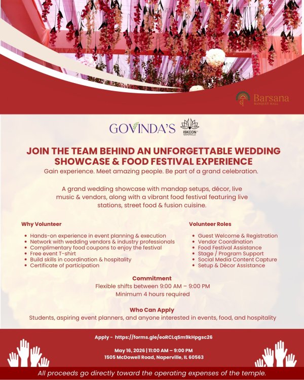 We’re looking for enthusiastic volunteers to help make ISKCON Govinda’s Summer Festival 2026 a joyful and memorable experience for our entire community. In the Hindu tradition, offering seva—selfless service—is a meaningful way to grow, build character and contribute to the wellbeing of others. If you’d like to share your time, energy or skills in this spirit, please sign up and join our team. Your support truly makes a difference and helps uplift everyone who attends.